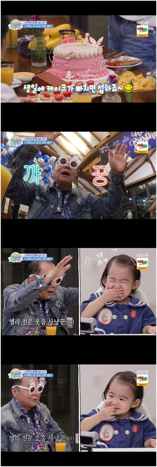 ‘슈퍼맨이 돌아왔다’ 배우 겸 가수 김윤지가 딸 엘라의 돌 사진 찍기 뒤로 시아버지 이상해의 생일 파티를 몰래 준비했다.