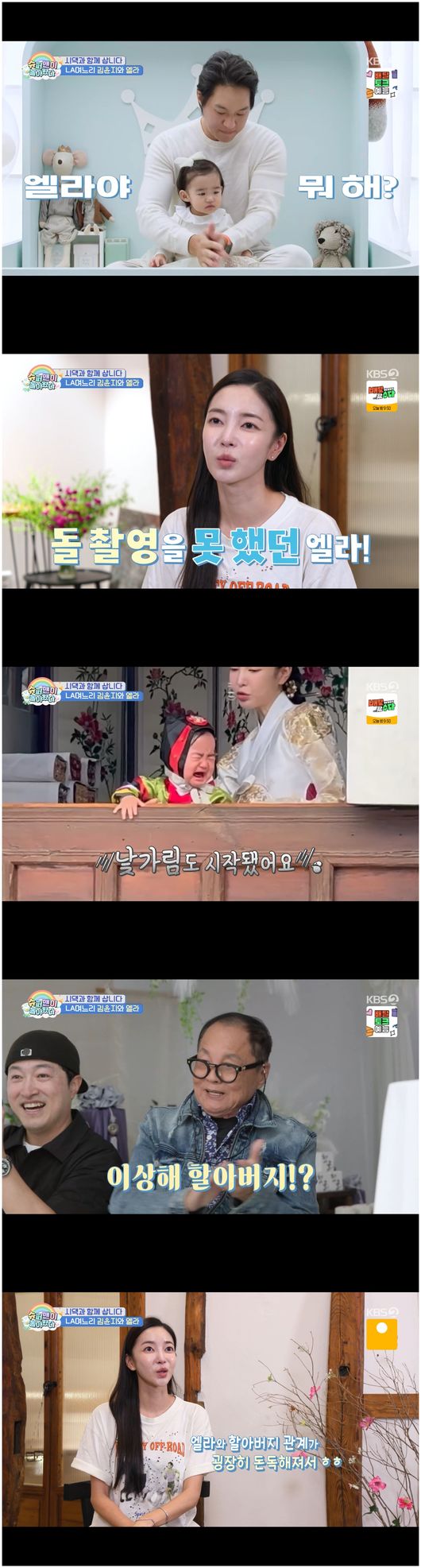 엘라는 과일을 좋아해 김윤지가 차려준 식사를 남김없이 해치웠다. 김윤지는 “언제 다 커서 혼자 앉아서 밥을 다 먹냐”라며 뿌듯해하더니, 이내 엘라와 함께 사진관으로 향했다. 김윤지는 “돌 잔치 때 너무 정신이 없어서 돌 촬영을 진행을 못했다”라며 사진 촬영을 하는 의미를 전했다. 돌이 지난 엘라는 사진을 찍을 때 낯을 가리거나 울어서 할아버지인 이상해가 등장했다. 할아버지만 보면 웃는 엘라는 금세 촬영을 마쳤다.