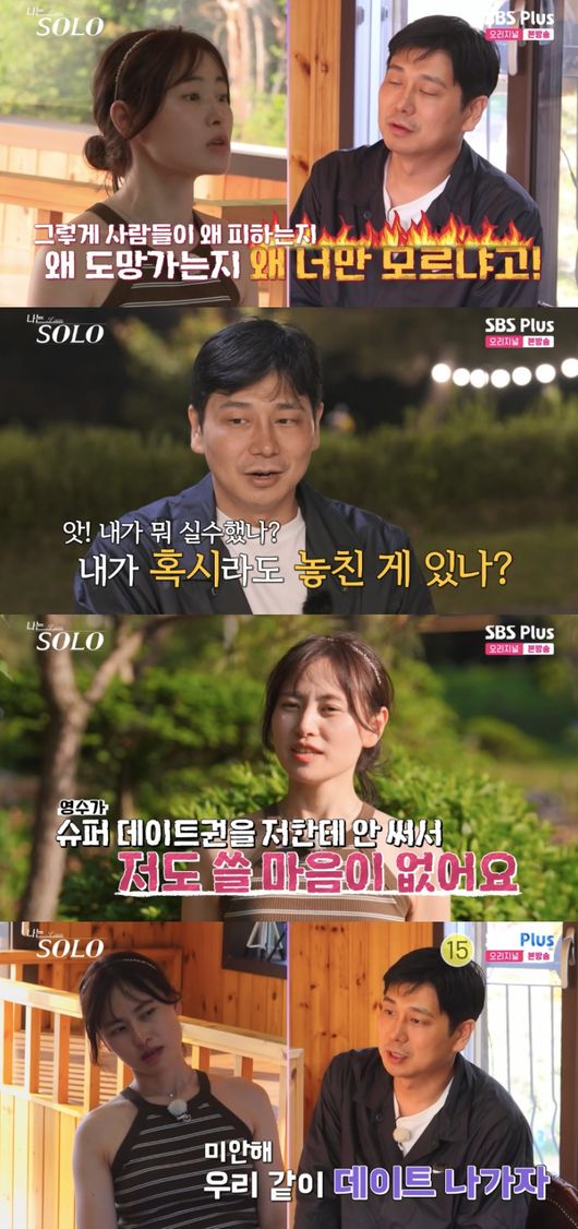 이후 영수는 다시 현숙에게 다가가 “미안하다. 우리 지금 같이 나가자”라며 말을 바꿔 슈퍼 데이트권을 현숙에게 사용했다. 이를 본 송해나는 “뭐래 진짜”라며 황당해했다. 그러나 현숙은 “눈물에 약하니까 선택한 거 아니냐”라며 “짜증나 농락당한 기분이다”라고 다시 박차고 나갔다.