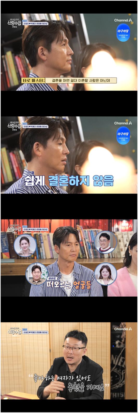 이정진과 박해리는 식사를 하기 전 색깔 타로를 보러 갔다. 이정진에 대해 타로를 치는 사람은 “이 색깔은 자기 주장이 강한 사람이다. 에너지가 많은 사람이다. 자기 주관을 고칠 생각이 없다”라면서 “그런데 검은색 카드를 뽑은 건 에너지를 억제하는 거다. 사람에게 신뢰를 주는 거다. 그래서 결혼을 하면 쉽게 이혼을 하지 않는다. 다만 결혼을 쉽게 하지 않는다”라며 설명했다. 아울러 타로 전문가는 “결혼을 안 하면 독거 노인처럼 된다. 자기가 외로움을 즐기며 느끼며 산다. 좋은 게 아니다”라며 지적했다.
