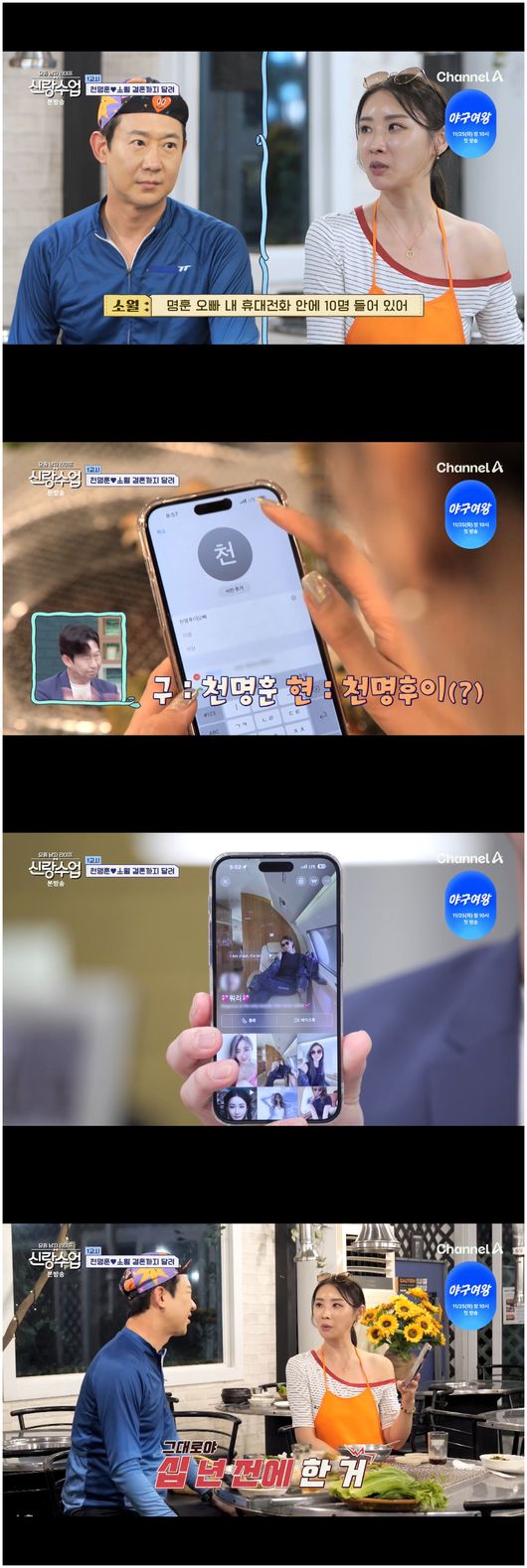 5일 방영한 채널A 예능 '요즘 남자 라이프 신랑수업'(이하 '신랑수업')에서는 팔당댐에서 라이딩을 한 천명훈과 소월, 성수동에서 데이트를 즐기는 이정진과 박해리의 모습이 그려졌다.