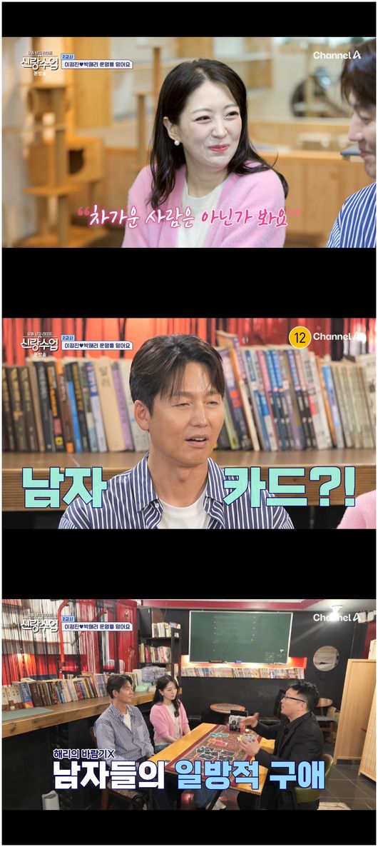 이정진은 이해리와 고양이 카페를 간 후 타로를 보러 갔다. 타로를 치는 사람은 “이 색깔은 자기 주장이 강한 사람이다. 에너지가 많은 사람이다. 자기 주관을 고칠 생각이 없다”라면서 “그런데 검은색 카드를 뽑은 건 에너지를 억제하는 거다. 사람에게 신뢰를 주는 거다. 그래서 결혼을 하면 쉽게 이혼을 하지 않는다. 다만 결혼을 쉽게 하지 않는다”라며 이정진에 대해 점쳤다.