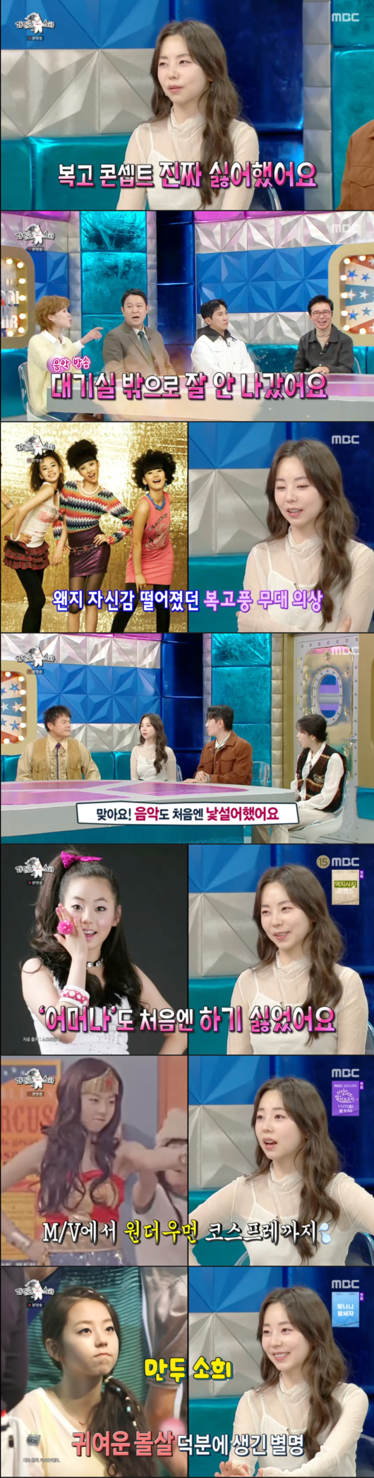 안소희는 자신이 활동했던 원더걸스 시절 복고 콘셉트에 대한 솔직한 심경도 공개했다. 그는 당시 멤버들 모두 복고 콘셉트를 싫어했다고 언급하며, 자신 역시 펑키한 머리와 복고 의상이 "정말 마음에 들지 않았다"고 고백했다.