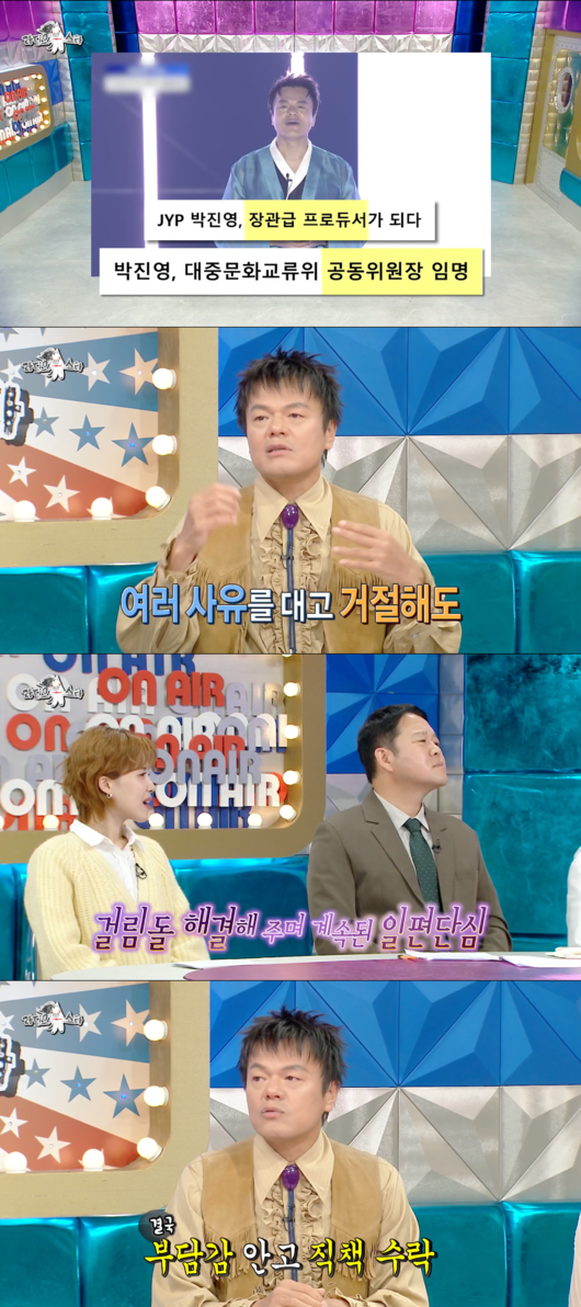 이를 듣던 김구라는 “월급도 안 받고, 명예직이냐”고 묻자, 박진영은 “일은 산더미인데요. 그럼 이 기회에 후배들과 K팝 전체에서 개인 회사 차원에서 할 수 없는 일을 해볼까 해서 결심하게 됐다. 부담은 어떤 정부냐에 따라 정치 성향을 띈 것처럼 보게 될 수 있고, 저 혼자면 괜찮은데 가수들이 있잖아요”라고 위원장직을 수락하기 전 걱정을 언급했다.