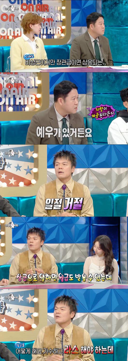 이에 김구라는 “비상근이지만 장관급이면 상응되는 예우가 있다. 차량이 제공된다거나”라고 물었고, 박진영은 “그런 것들이 있는데 제가 다 (거부했다)”라고 밝혔다. 박진영은 “연봉이나 월급도 상근이면 받을 수 있는데, 상근을 어떻게 하냐. 가수하고 ‘라디오스타’ 해야 하고”라고 말하며 장관급에 해당하는 연봉이나 의전도 받지 않는다고 했다.