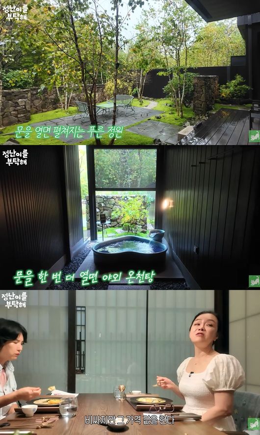 온천을 마친 두 사람은 저녁으로는 9가지 코스로 준비되어 있는 퓨전 한식을 즐겼다. 그는 "감동이다. 내일 아침에도 13첩으로 나온다는데, 비싸지만 충분히 그 가격 값을 한다"라며 만족해 눈길을 끌었다.