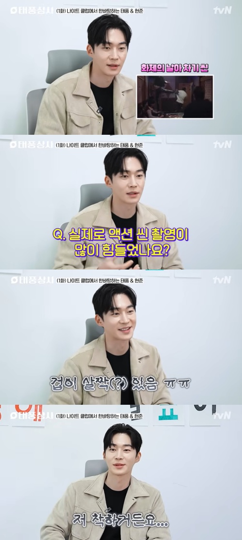 "실제로 액션신 촬영이 많이 힘들었나?"라는 질문에 "실제로 태풍이랑 붙는 건 없었다. 항상 현준이는 태풍이한테 겁이 살짝 있다. 자세히 보면 크게 뭘하진 않는다. 화풀이는 다른 곳에 한다. 직원분들은 아무 죄가 없는데"라며 웃었다.