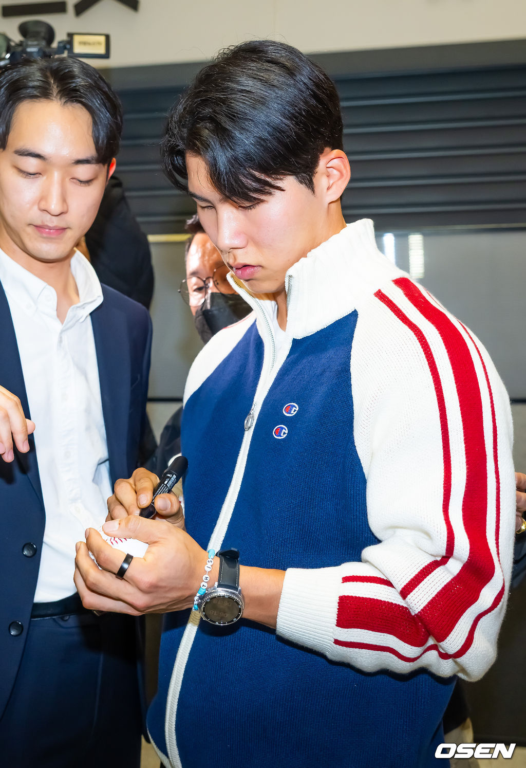 김혜성이 입국장 앞에서 팬들에게 사인을 해주고 있다. 2025.11.06 /rumi@osen.co.kr
