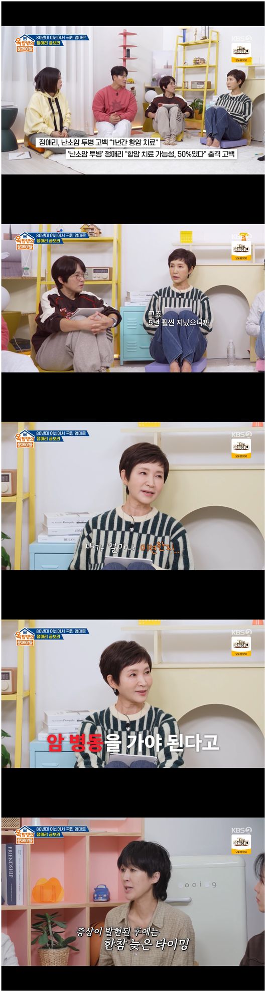 ‘옥탑방의 문제아들’ 배우 정애리가 난소암 투병 중 홍진경의 투병을 보며 많은 걸 배웠다고 밝혔다.