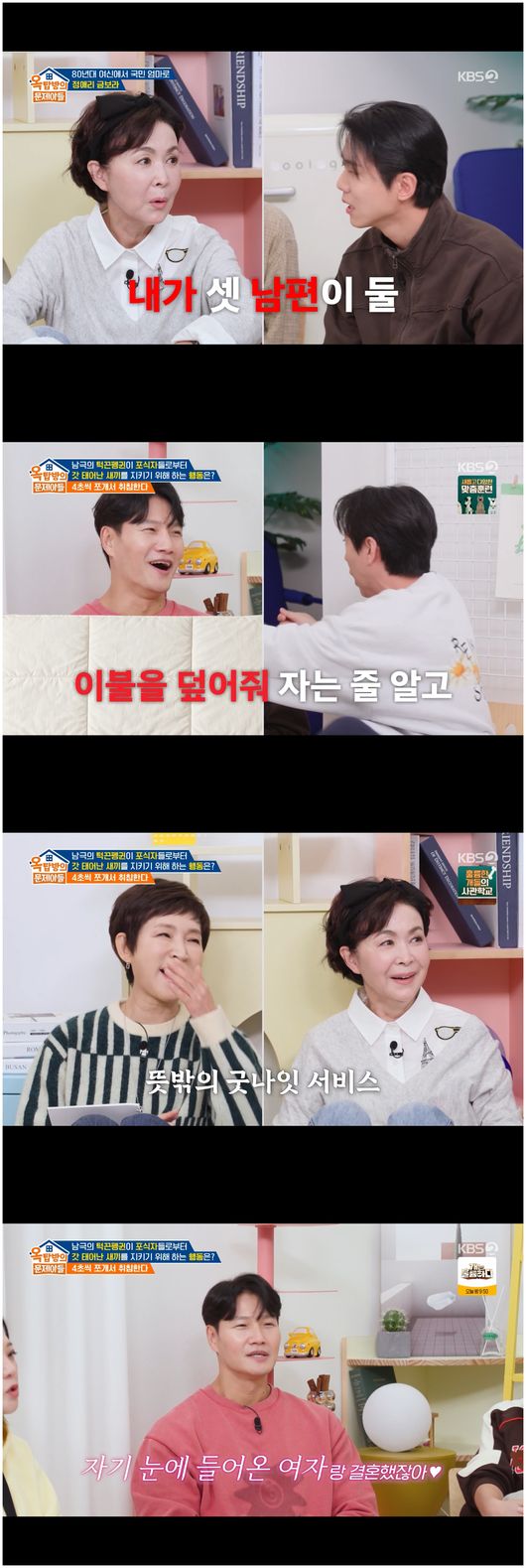 현재 재혼 후 아이가 다섯이 된 금보라는 37살, 35살 아들들과 잠시 같이 살았다가 질색인 표정이 되었다. 그는 "아이들이랑 정말 같이 못 살겠더라. 애들이 나더러 세수하고 난 후의 흔적에 대해 묻더라"라고 말했다. 그러면서도 금보라는 어머니에게 알뜰살뜰하게 구는 정애리의 딸에 대해서 듣더니 "언니, 딸 나 줘. 며느리로 보내. 우리 집에 37살, 35살 있어"라며 부러움을 표했다.