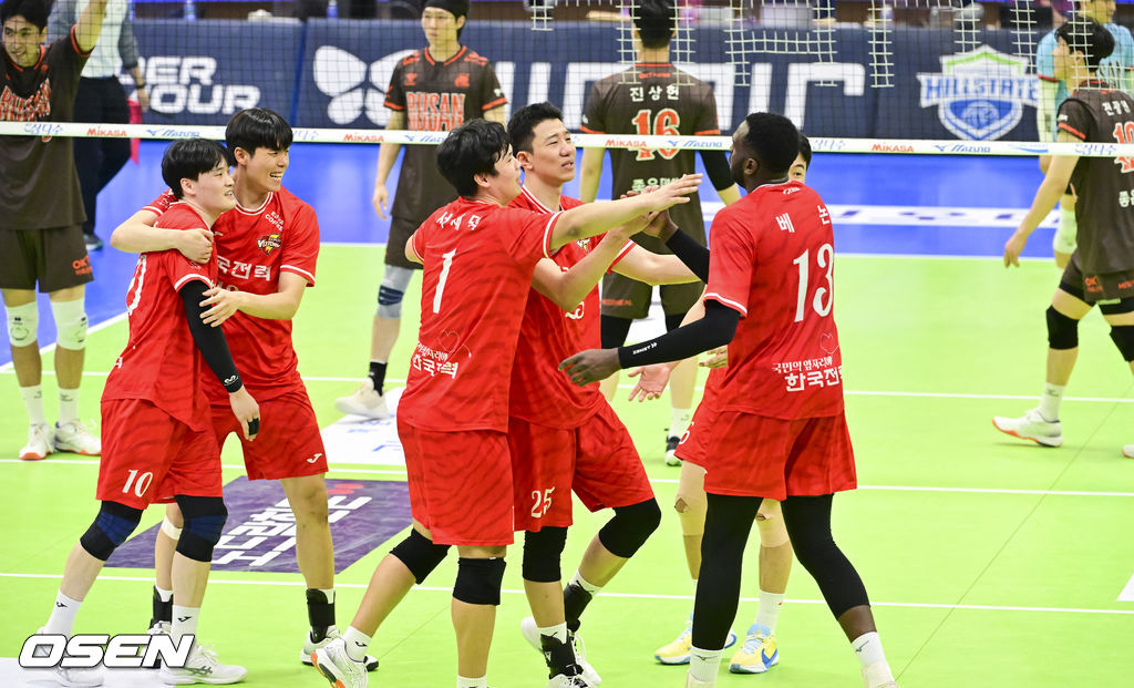 한국전력이 6일 수원실내체육관에서 열린 진에어 2025~2026 V-리그 남자부 1라운드 경기에서 OK저축은행을 3-2(30-28, 25-18, 23-25, 20-25, 15-12)로 꺾고 2연승 달성했다.