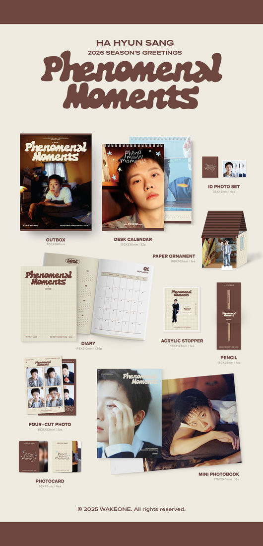 이번 시즌그리팅은 아웃박스, 캘린더, 미니 포토북, 다이어리, 페이퍼 오너먼트, 증명사진, 포토카드, 연필, 아크릴 스토퍼, 네컷 포토 등으로 구성됐다. 전반적으로 베이지와 브라운 톤의 따뜻한 색감과 내추럴한 디자인을 적용해 감각적인 무드를 더했으며, 모든 구성품에는 'PHENOMENAL MOMENTS' 타이틀 로고가 담겨, 하나의 오브제처럼 완성도 높은 패키징을 선보인다.