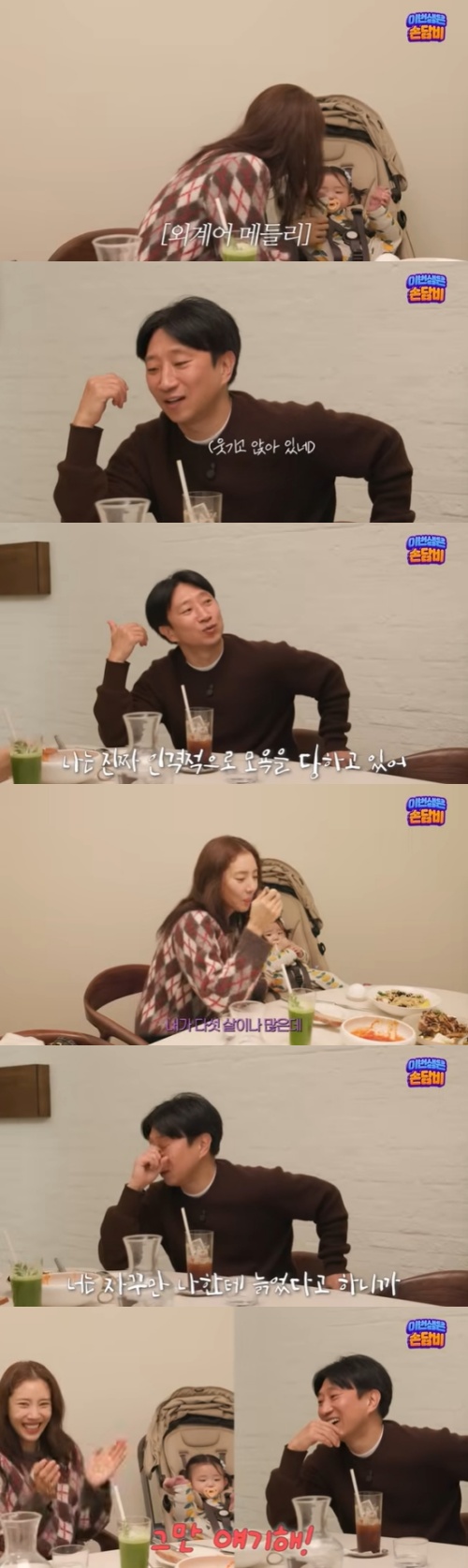 손담비는 "근데 오빠 늙긴했지, 48살에 처음 애를 가졌는데"라며 웃었다. 이규혁은 "그만해. 너도 한 말 또하는 스타일이다. 나한테 꼰대라고 하면서"라며 억울해했고, 손담비는 "오빠가 꼰대는 맞잖아"라고 말해 웃음을 자아냈다.
