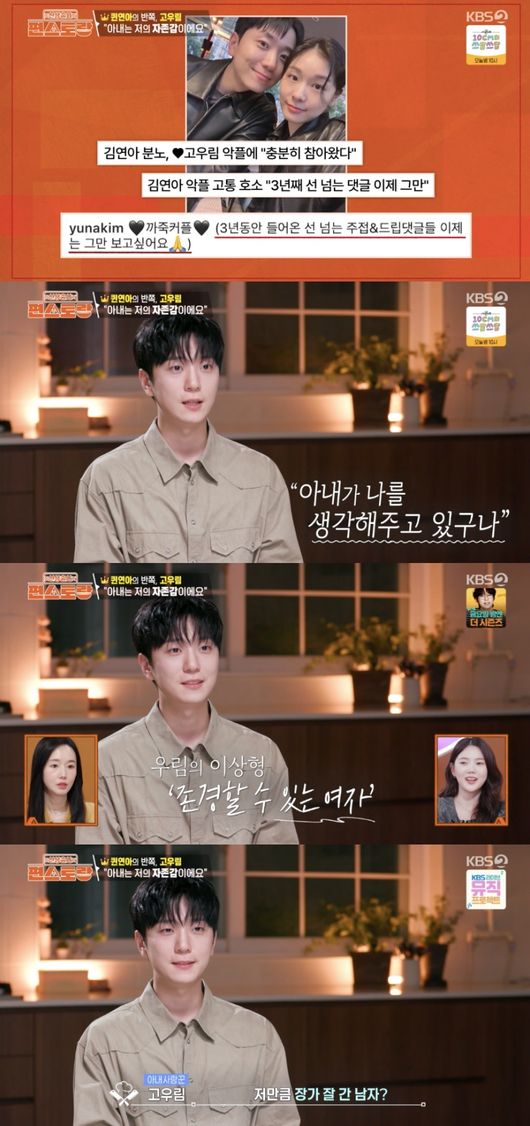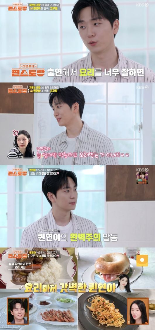 이날 고우림은 ‘편스토랑’ 출연에 대한 김연아 반응을 묻자 “되게 좋아했다. 유명한 프로그램 나간다고 좋아했는데 (아내가) 나가서 만약에 요리 잘하는 모습을 보면, 본인이 늘 얻어만 먹는다고 오해하는 거 아니냐, 나가서 말 잘해라고 했다”라고 말해 웃음을 자아냈다.