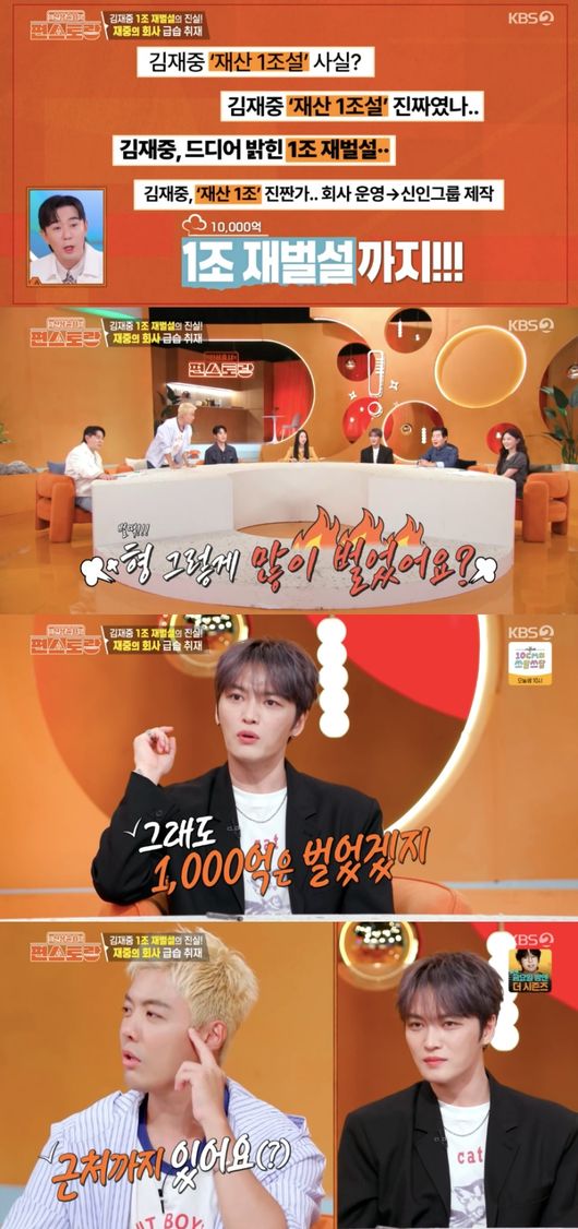 김재중은 네티즌 사이에 재산만 약 1,000억 원을 넘어 1조 재벌설까지 돌았다. 이를 본 강남은 “형 그렇게 많이 벌었냐”라고 놀랐다.