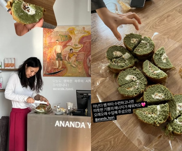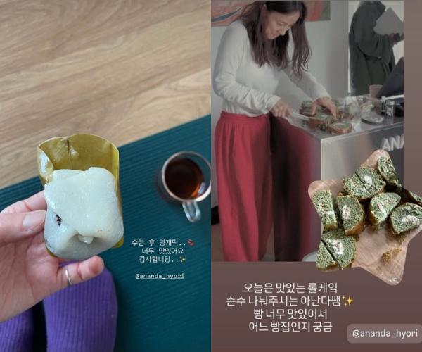 공개된 사진 속에는 수강생들의 다양한 인증샷이 눈에 띄었다. "효리쌤과 함께하는 날이갈수록 더 재밌어지는 아침 요가, 나눠주신 떡과 차도 맛있었습니다", "수련 후 망개떡과 보이차 너무 맛있어요", "오늘은 맛있는 롤케이크 손수 나눠주시는 아난다쌤 빵 너무 맛있어서 어느 빵집인지 궁금" 등의 글이 게재됐다.
