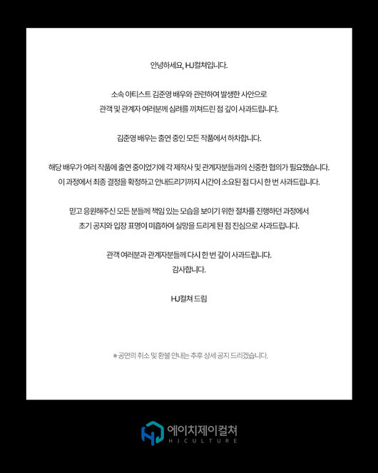 이에 대해 소속사 HJ컬쳐는 “온라인상 제기되고 있는 의혹들과 관련해 (김준영) 배우에게 그 어떠한 불법 행위도 없었음을 명확히 밝힌다”고 부인했다.