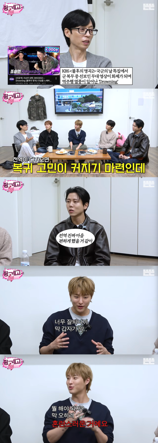 이날 유재석은 “우즈는 다른 것보다 전역을 앞두고 노래가 대박이 나면서, 사실 연예계에 계신 분들은 내가 연예계에 나가서 어떻게 잘 복귀할까 고민한다. 여러 고민이 생긴다. 근데 우즈는 전역할 쯤에 노래가 대박이 나서”라고 했고, 주우재도 “전역 진짜 맘 편하게 했을 것 같다”고 거들었다.
