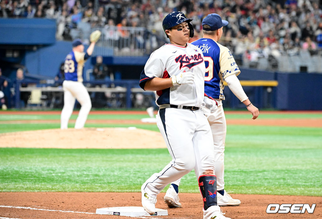 6회말 1사 2루에서 한국 한동희가 땅볼을 날린 후 체코 유격수 포구실책으로 출루하고 있다. 2025.11.08 /cej@osen.co.kr