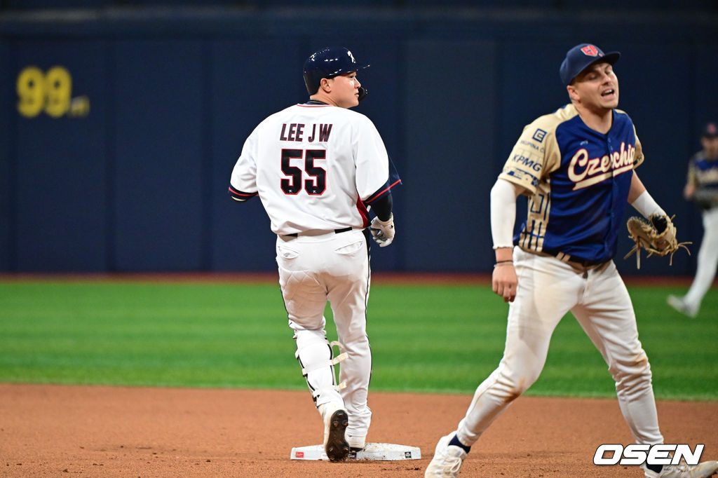 8회말 2사 1,2루에서 한국 이재원이 1타점 2루타를 날린 뒤 런다운에 걸려 태그아웃 당했다. 2루 베이스를 밟은 뒤 공을 확인 중인 이재원. 2025.11.08 /cej@osen.co.kr