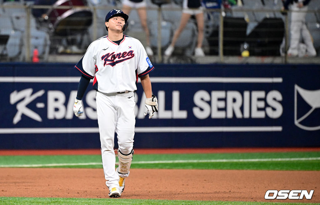 8회말 2사 1,2루에서 한국 이재원이 1타점 2루타를 날린 뒤 런다운에 걸려 태그아웃 당한 뒤 아쉬워하고 있다. 2025.11.08 /cej@osen.co.kr