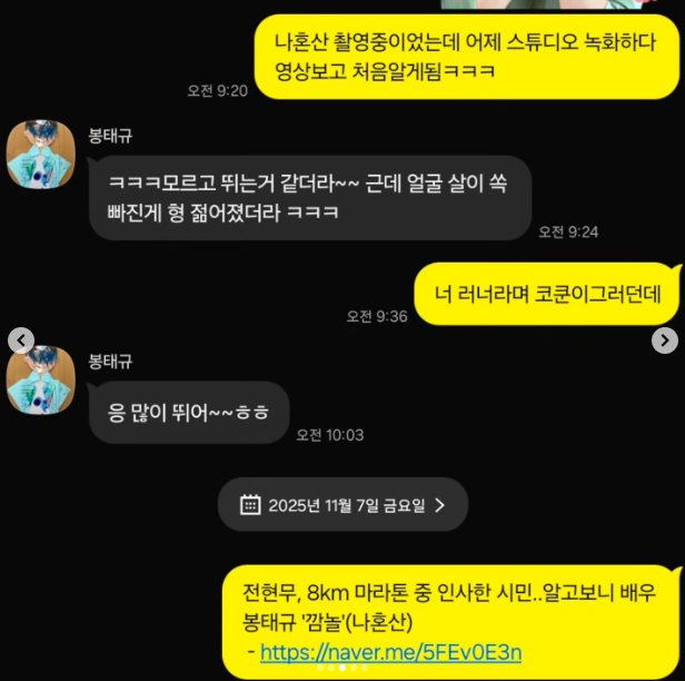 방송을 통해 뒤늦게 알아본 전현무는 이후 봉태규와 주고 받은 메시지를 공개했다. 전현무는 ‘나혼산 촬영중이었는데 어제 스튜디오 녹화하다 영상보고 처음 알게 됨’이라고 했고, 봉태규는 ‘모르고 뛰는 거 같더라. 근데 얼굴 살이 쏙 빠진게 형 젊어졌다’고 답해 훈훈함을 자아냈다.