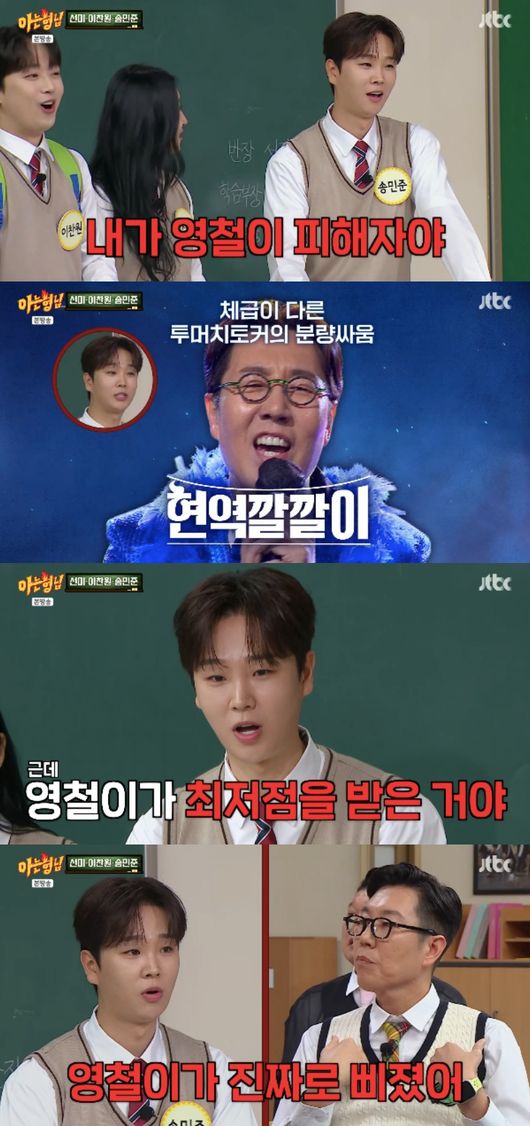 이날 송민준은 “내가 영철이 피해자다. 나는 심각한 피해를 봤다”라고 밝혀 이목을 끌었다. 그는 “영철이랑 ‘현역가왕’이라는 걸 했다. 내가 영철이 다음 무대였다. 영철이가 역대 최저점을 받았는데 진짜로 삐진 거다. 자기 무대 다음부터는 버튼을 안 눌렀다”라고 일화를 전했다.