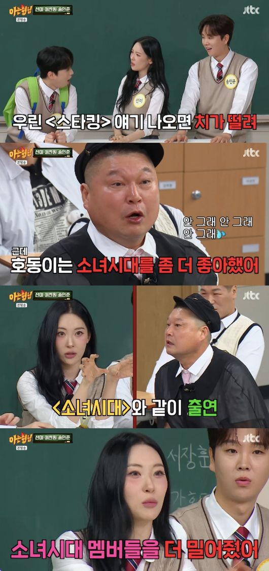 편애 논란에 술렁이는 분위기. 선미는 “우리가 소녀시대랑 같이 출연한 적이 있는데 호동이가 소녀시대 멤버들을 좀 더 밀어줬다”라고 못 박았다.