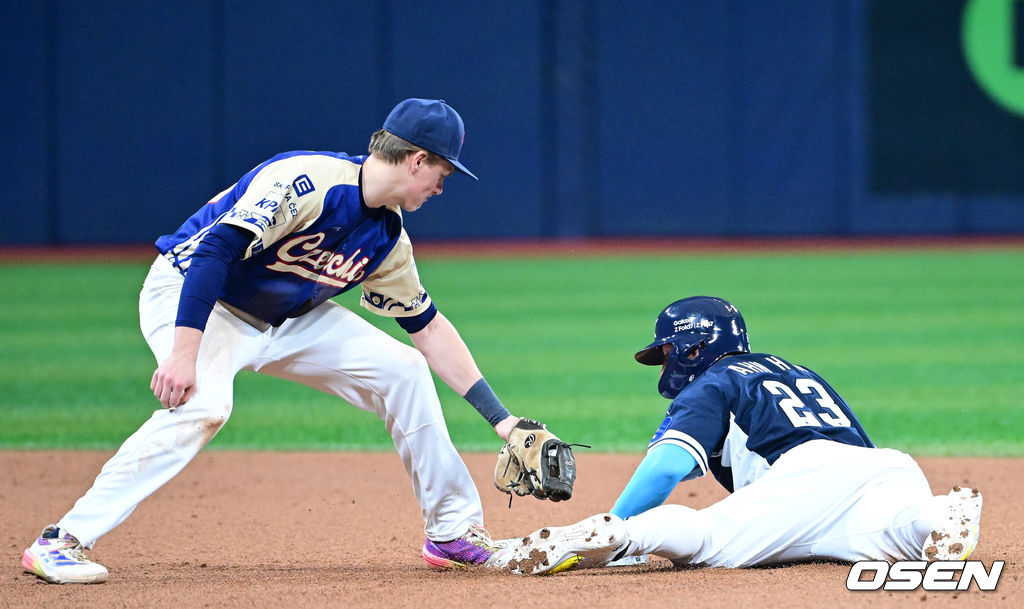 3회초 1사 1루 상황 한국 송성문 타석 때 주자 안현민이 2루 도루에 성공하고 있다. 2025.11.09 / dreamer@osen.co.kr