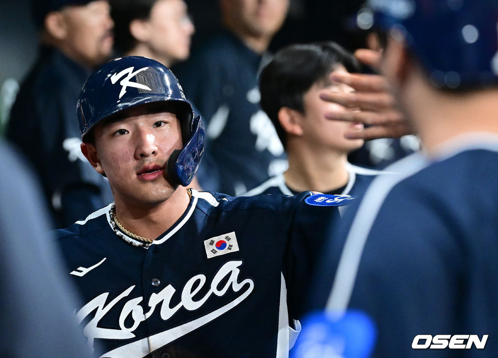 3회초 1사 1, 3루 상황 한국 문보경의 내야 땅볼 때 득점을 올린 안현민이 더그아웃 동료들과 인사를 나누고 있다. 2025.11.09 / dreamer@osen.co.kr