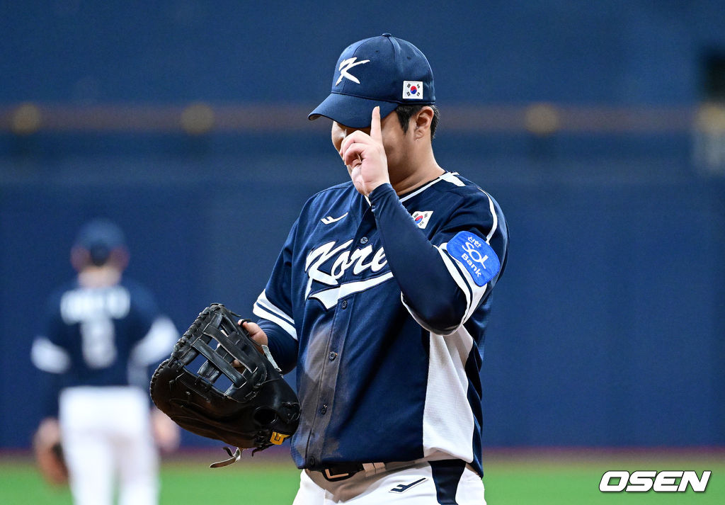 3회말 무사 선두타자로 나선 체코 윈클러의 땅볼 타구를 잡아낸 한국 1루수 문보경이 동료들에게 제스처를 보내고 있다. 2025.11.09 / dreamer@osen.co.kr