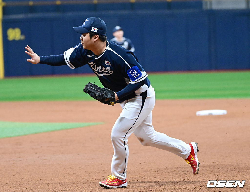 3회말 2사 주자없는 상황 체코 프로콥의 땅볼 타구를 잡은 한국 1루수 문보경이 1루 베이스로 향하며 제스처를 보내고 있다. 2025.11.09 / dreamer@osen.co.kr