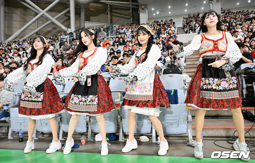 한국 대표팀 강수경, 이주은, 최홍라, 차영현 치어리더가 체코 전통 의상을 착용하고 응원을 하고 있다. 2025.11.09 / rumi@osen.co.kr