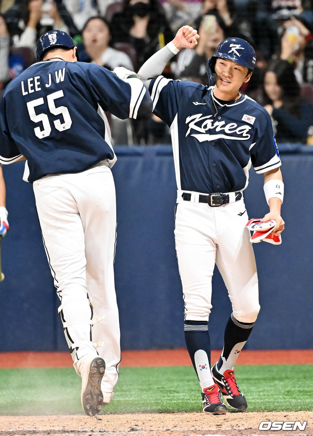 9회초 무사 1루 상황 한국 이재원이 달아나는 중월 투런포를 때린 후 홈을 밟으며 박해민과 하이파이브를 하고 있다. 2025.11.09 / rumi@osen.co.kr