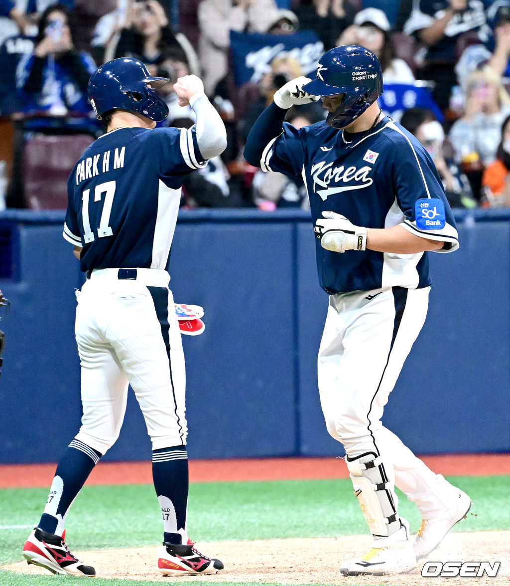 9회초 무사 1루 상황 한국 이재원이 달아나는 중월 투런포를 날리고 홈을 밟은 뒤 박해민과 기뻐하고 있다. 2025.11.09 / dreamer@osen.co.kr