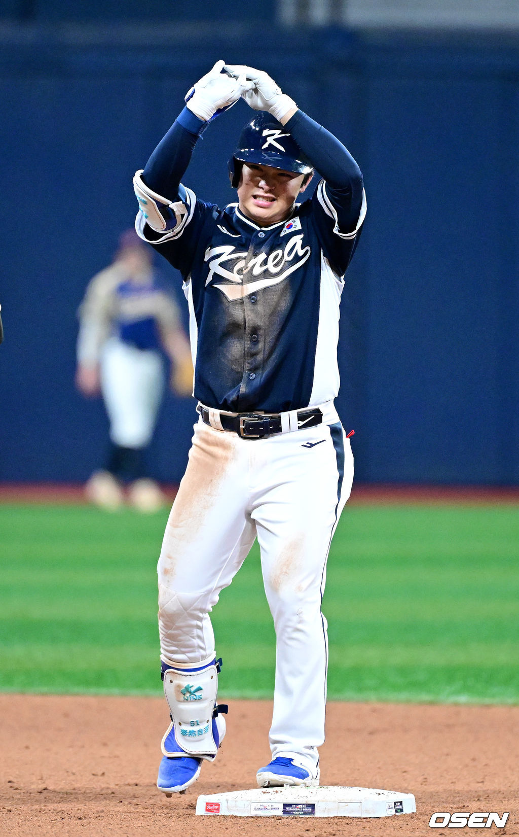 9회초 2사 2루 상황 한국 문현빈이 달아나는 1타점 2루타를 날리고 2루에 안착해 기뻐하고 있다. 2025.11.09 / dreamer@osen.co.kr