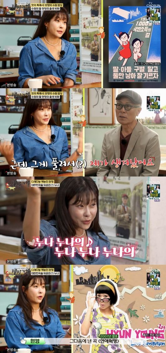 이날 현영은 출생의 비화를 공개했다. 인구가 급격히 늘어나던 1970년대, ‘둘만 낳아 잘 기르자’던 그때 그 시절, 현영의 아버지는 더 이상의 자식은 없다고 생각해 수술을 받았다고.