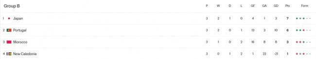 이번 결과로 B조는 포르투갈이 3전 전승으로 조 1위, 일본이 2승 1무로 2위, 모로코가 1승 2패로 3위를 차지했다.