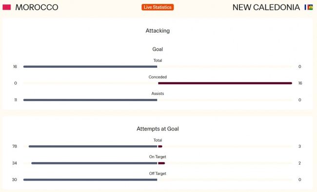 모로코는 기다렸다는 듯이 폭격을 시작했다. 전반에만 7골, 후반에 9골을 추가하며 최종 스코어 16-0. 총 78개의 슈팅 중 유효슈팅이 42개에 달했다. 월드컵 본선 무대에서 보기 힘든 ‘일방적 학살극’이었다.