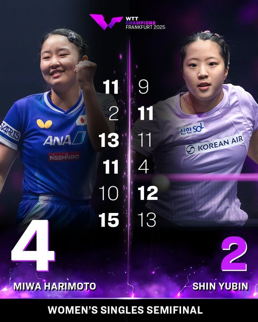 세계랭킹 12위 신유빈은 9일(한국시간) 독일 프랑크푸르트 쉬바크 에네르기 아레나에서 열린 월드테이블테니스(WTT) 챔피언스 여자단식 4강전에서 7위 하리모토에게 2-4(9-11 11-2 11-13 4-11 12-10 13-15)로 졌다. 54분의 접전 끝에 끝내 마지막 매치포인트를 내줬다.