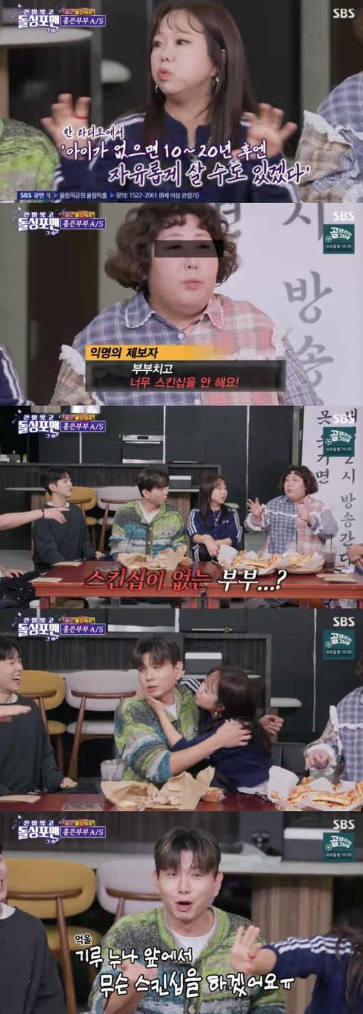 ‘이혼설’ 제보자로 나선 신기루는 “부부 치고는 너무 스킨십을 안 한다”라고 말했고 이 말 끝에 홍현희는 다급하게 제이쓴에게 뽀뽀를 했다. 제이쓴은 “기루 누나 앞에서 왜 스킨십을 하냐”라고 해명했고, 신기루는 “오늘 뽀뽀 처음 한 것이다”라고 이혼설을 부추겼다.