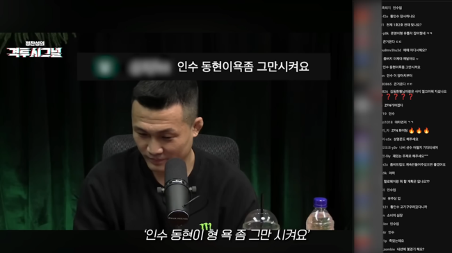 이 때문에 정찬성이 방송을 하면 빠지지 않고 황인수의 이름이 언급되는 상황. 앞서 라이브 방송 도중에는 "인수 동현이 욕 좀 그만 시켜요"라는 채팅이 적히기도 했다. 이를 본 정찬성은 "내가 시켰니? 내가 시켰어요?"라며 헛웃음을 지었고, 이 발언도 재차 논란에 휩싸였다.
