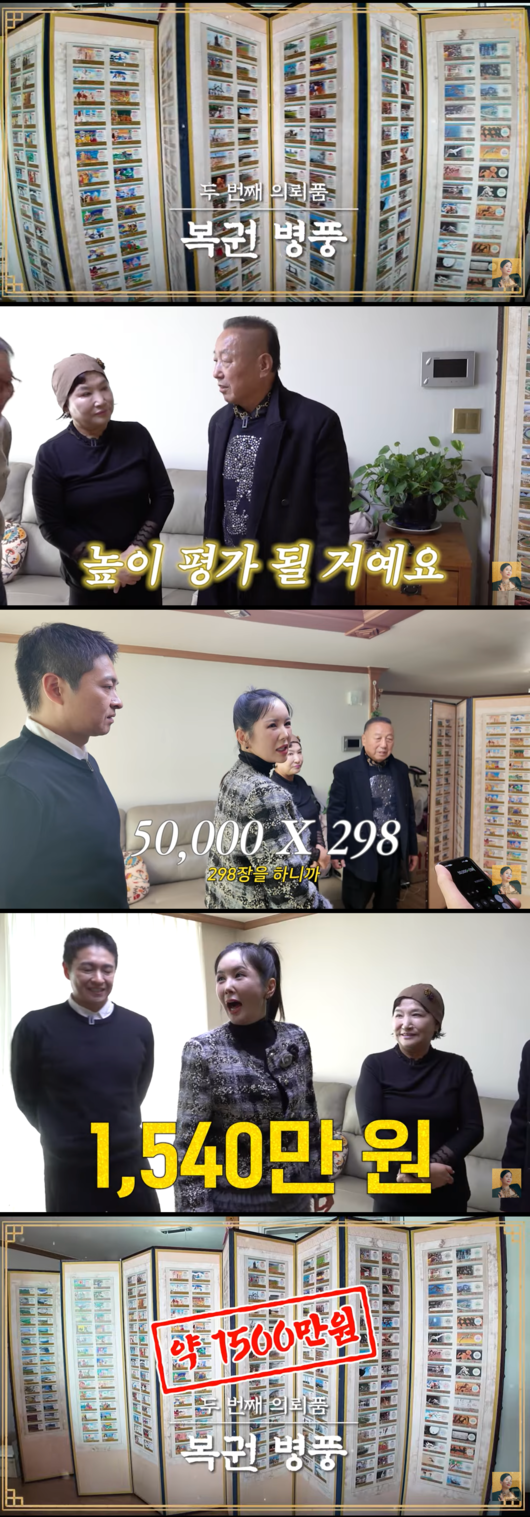 전문가는 감정을 이어가 "전체가 다 똑같은 가격은 아니다. 1회는 50만 원에 팔리지 않을까"라고 구체적인 가치를 언급했다. 최종적으로 298장에 달하는 이 복권 병풍의 총 가치는 약 1,500만 원으로 산정됐다. 이를 들은 장영란은 깜짝 놀라는 모습을 감추지 못했다.