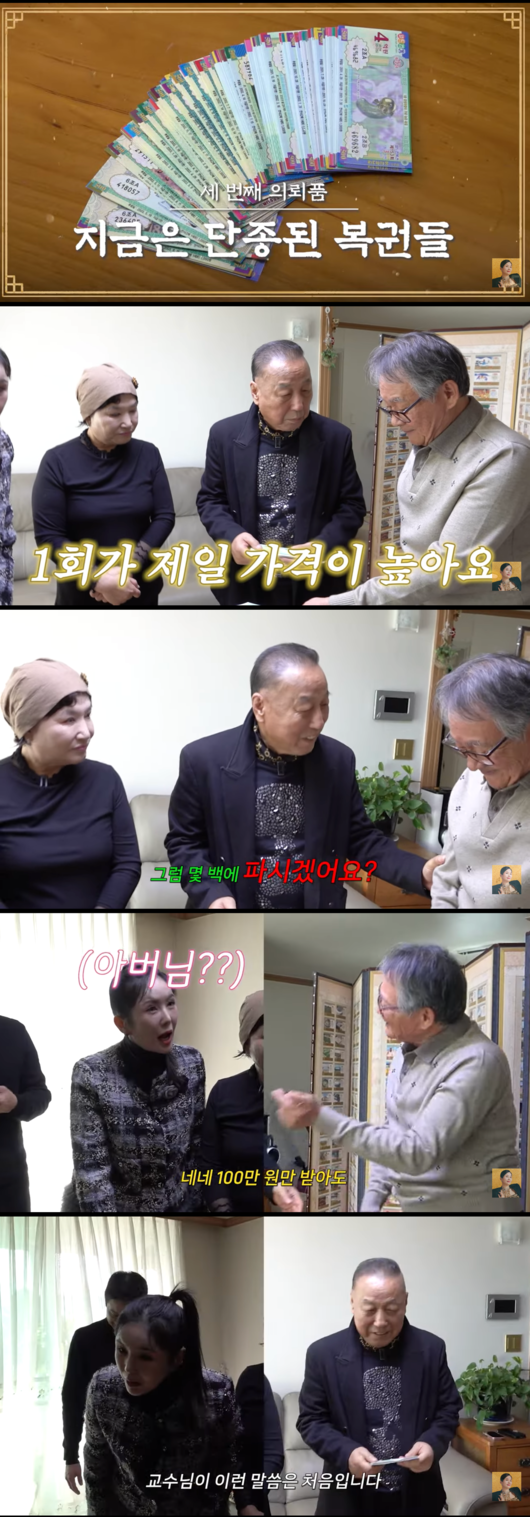 전문가는 곧바로 시아버지에게 "그럼 몇 백에 파시겠어요?"라고 즉석에서 판매 의사를 물었다. 시아버지는 순박하게 "네네, 100만 원만 받아도"라고 답하며 헐값에 팔려는 모습을 보였다. 이 상황을 지켜보던 장영란은 깜짝 놀라 "아니요, 아버님 왜 그러세요!"라며 소리를 질러 좌중을 폭소케 했다.