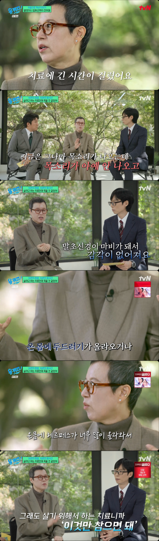'유 퀴즈 온 더 블럭’ 개그우먼 박미선이 힘겨운 항암 치료 과정에 대해서도 솔직하게 털어놨다.