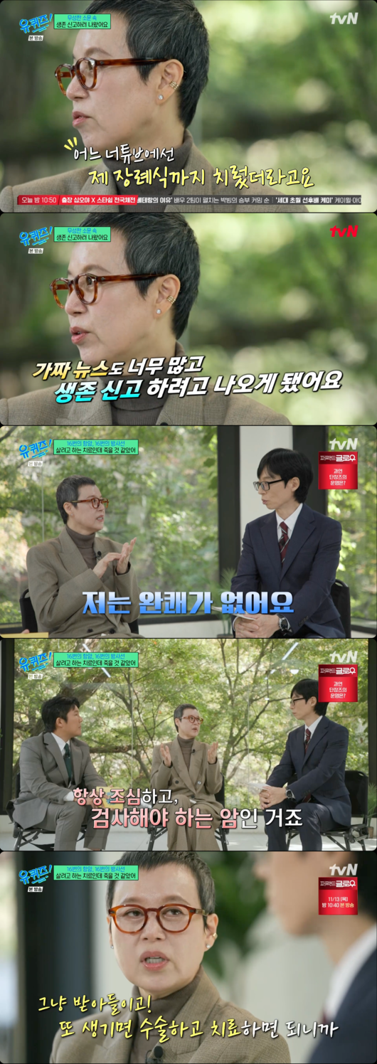 '유 퀴즈 온 더 블럭’ 박미선이 길고 고통스러운 투병 끝에 암을 대하는 초연한 자세를 갖게 되었다고 밝혔다.