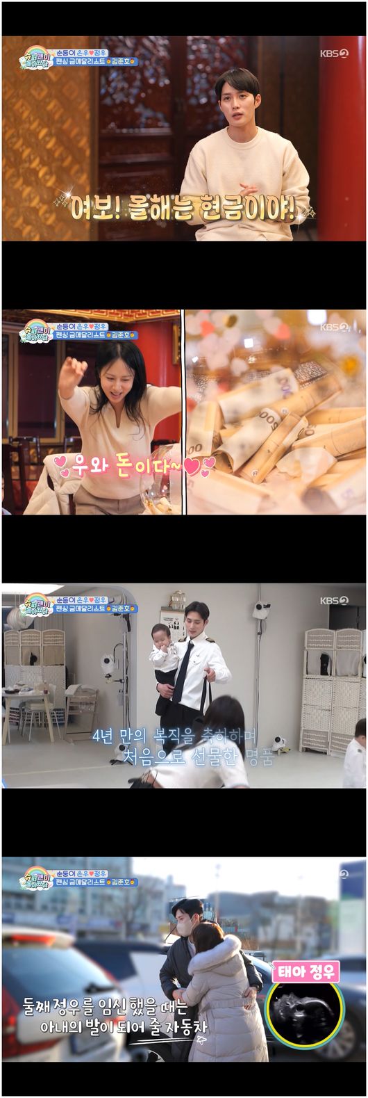 은우 돌잔치 때 유정현 씨에게 쓴 손편지, 정우 임신 당시 편히 다니라며 사준 차, 그리고 두 형제를 낳은 후 4년 만에 복직하는 유정현 씨를 위한 명품백 등 김준호가 선물한 것은 다양했다. 이번에 현금을 준비한 그는 "아내가 필요한 걸 사길 바란다"라는 마음에서 비롯됐다고 설명했다. 유정현 씨는 “둘이서 온 데를 넷이서 와서 감회가 남다르고, 생일 선물도 준비해줘서 정말 고맙습니다, 여보”라며 행복한 미소를 지어보였다./osen_jin0310@osen.co.kr