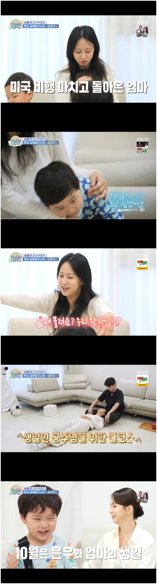 김준호는 아내 유정현 씨와 오랜만에 시간을 보냈다. 유정현 씨의 생일이기도 하여 김준호는 직접 아내의 얼굴에 크림을 발라주며 에스테틱을 주도했다. 아들 은우와 정우도 엄마를 "공주님"이라고 부르며 엄마의 얼굴을 만졌다.