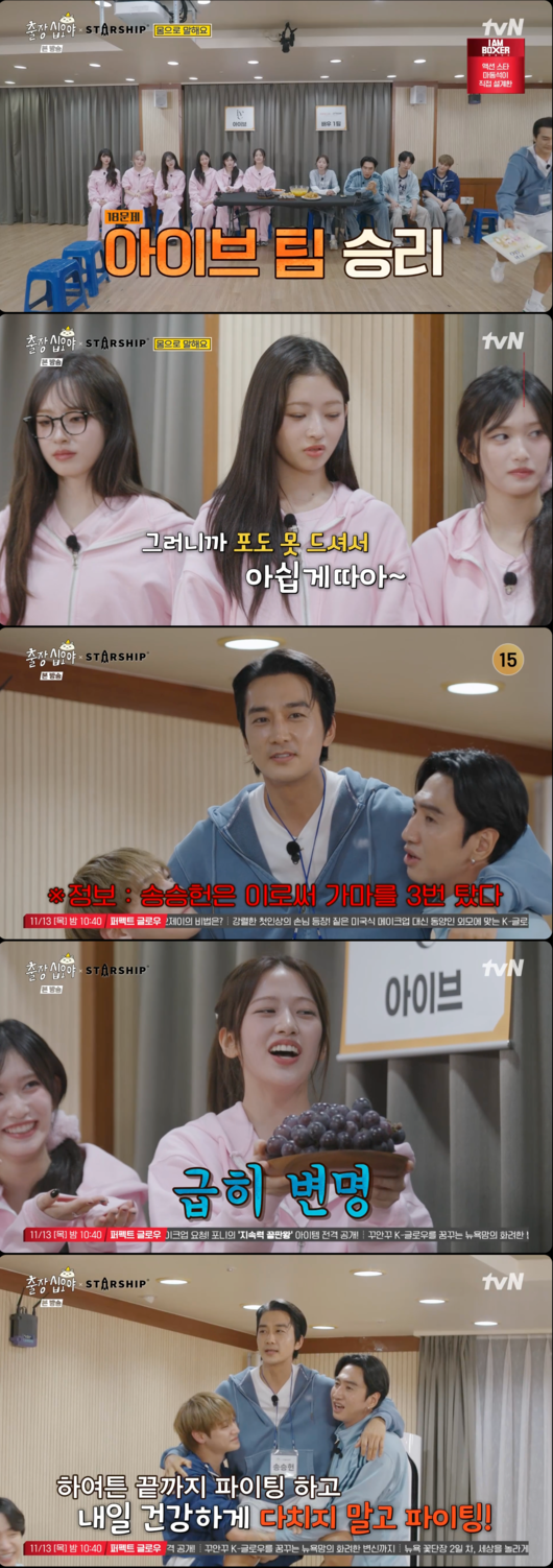 팀 대항전 첫 번째 경기는 이기는 팀이 푸짐한 음식을, 지는 팀이 과자를 가져가는 '야식 쟁탈전'으로, 종목은 '몸으로 말해요'였다. 경기에 앞서 송승헌은 야식으로 '포도'를 강력하게 요청했다. 나영석 PD가 "포도는 (아이브의) 레이가 먹고 싶다고 해서"라고 중재했지만, 송승헌은 단호하게 "포기할 수 없습니다!"라고 '칼답'하며 포도에 대한 집착을 드러내 폭소를 유발했다.
