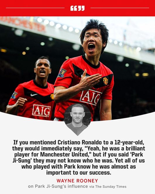 당시 루니는 "만약 지금 12살 아이에게 호날두의 이름을 꺼낸다면 '맨유에서 엄청난 선수였죠'라고 말할 거다. 하지만 박지성의 이름을 말한다면 아마도 그가 누구인지 잘 모를 거다. 하지만 박지성과 함께 뛰어봤던 우리 모두는 그가 맨유의 성공에서 거의 호날두만큼이나 중요했다는 걸 알고 있다"라고 말했다.